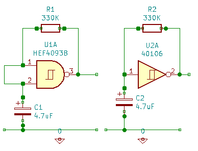 Le schéma de base est basé sur une porte NON qui est rebouclée sur elle même avec un réseau RC pour réaliser une temporisation.