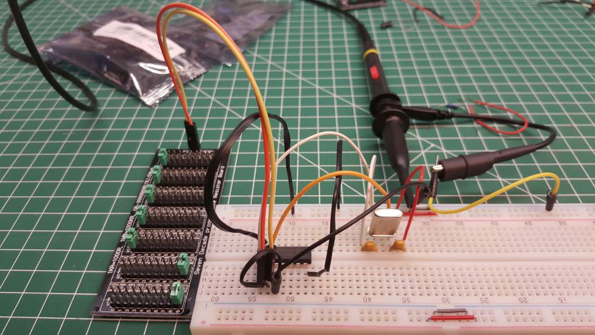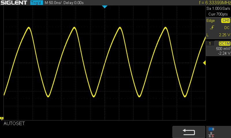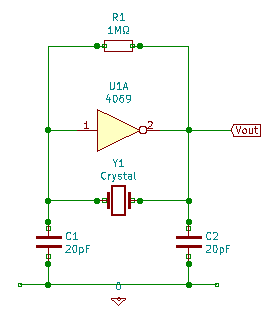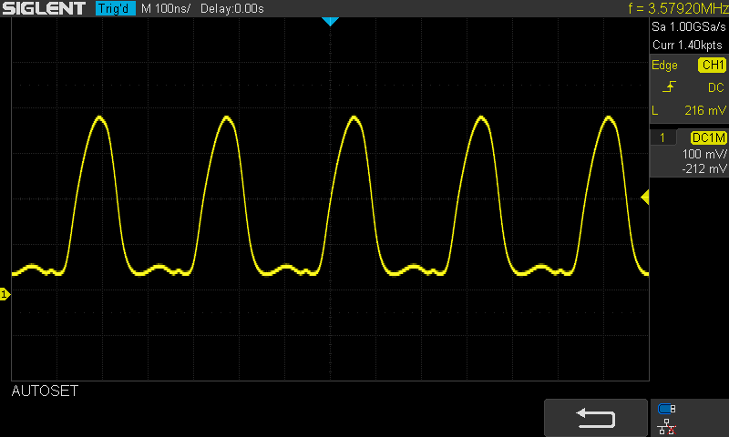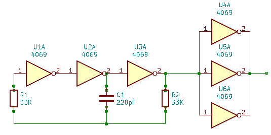 L'exemple réalisé ci-dessus avec un quartz 3.579545Mhz, donne à l'oscillo une fréquence de 3.57920Mhz, ce qui contenu des erreurs de mesures indique que le schéma fonctionne correctement. On notera tout de même une onde assez déformée. Aussi vous trouverez souvent une porte NON derrière pour rendre le signal "carré".