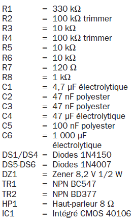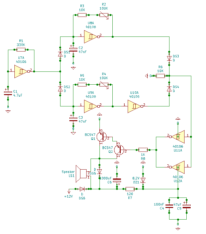 Pour finir voici le schéma d'une sirène bi-ton qui utilise trois oscillateurs. Le premier oscillateur donne la fréquence de base des inter-ton. Les deux autres oscillateurs pour les deux tonalités, à noter les potentiomètres pour faire varier les fréquences.