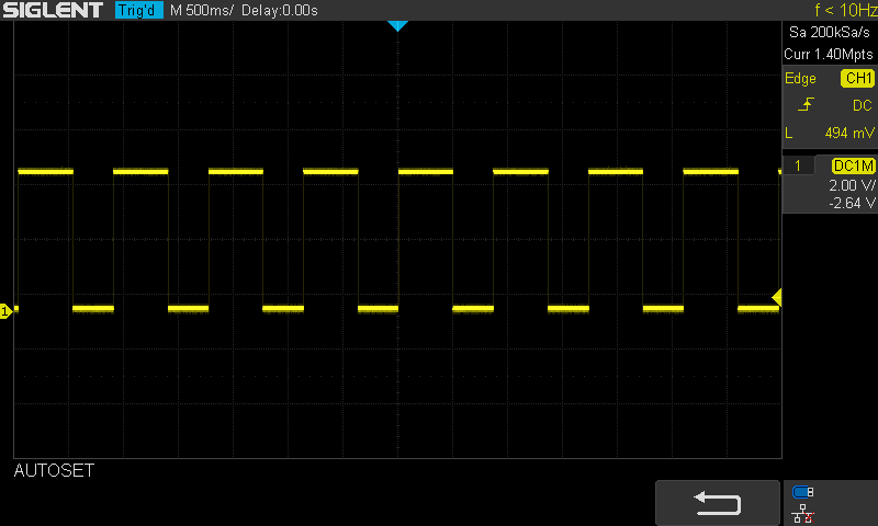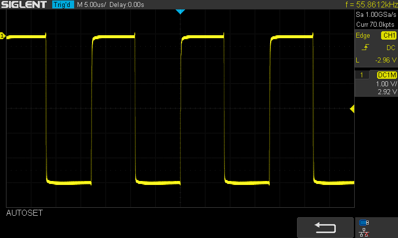 On utilise les portes non utilisées du CD4069 en parallèle pour améliorer l'alimentation électrique de l'oscillateur. On obtient un signal avec une fréquence de 55.8khz dans cet exemple :