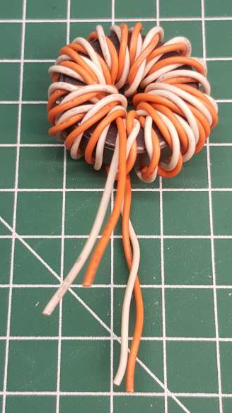Pour les inductances, j'ai pris un tore de ferrite de récupération et 60cm de double cordons torsadés. Il suffit alors de faire son enroulement comme ci-dessous.