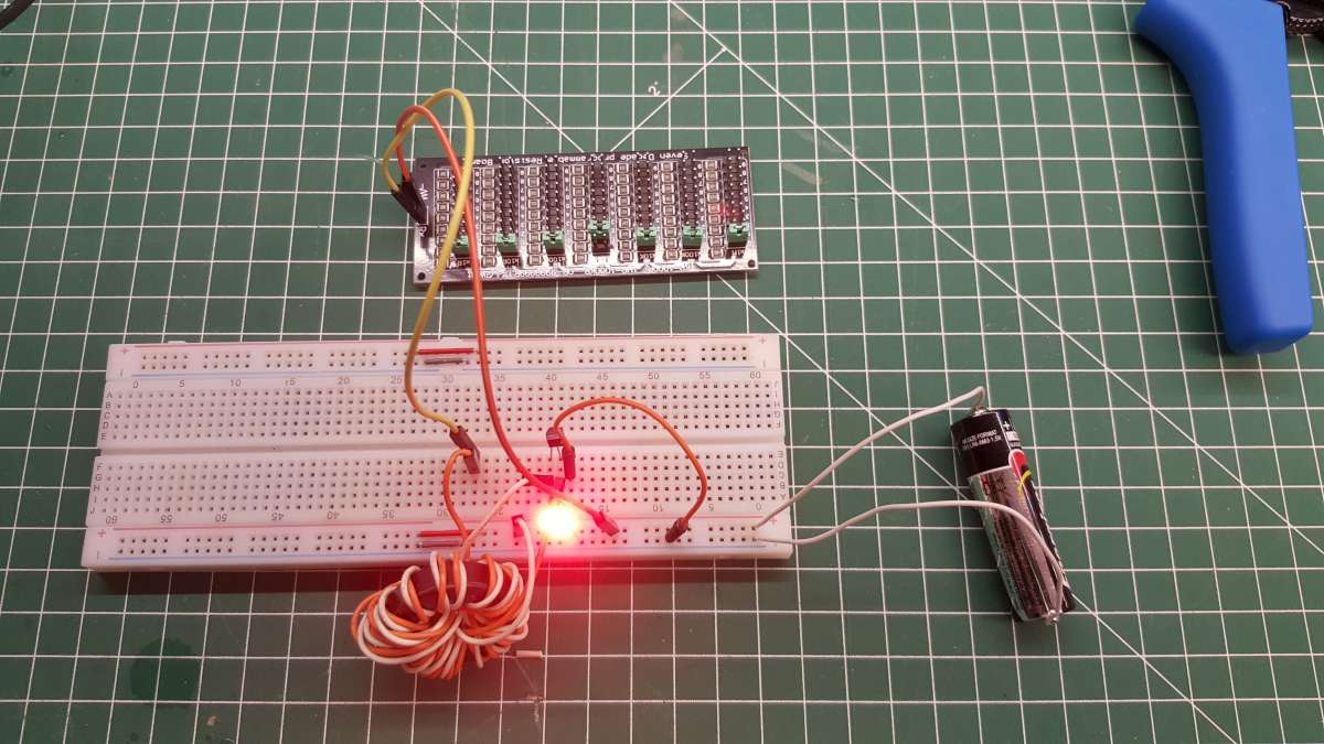 Si on réalise, le schéma du joule thief avec nos inductances, la LED s'allume effectivement, assez fort même!