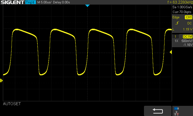 A l'oscilloscope, on observe la tension VCE, et donc l'oscillation générée entre les deux inductances. La fréquence est de l'ordre de 63khz avec un pic de tension de 2V qui correspond au seuil de la diode rouge.