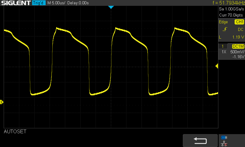 Si je diminue la résistance de la base de 1K à 300 ohms, la fréquence diminue à 50Khz et la tension est un peu déformée.