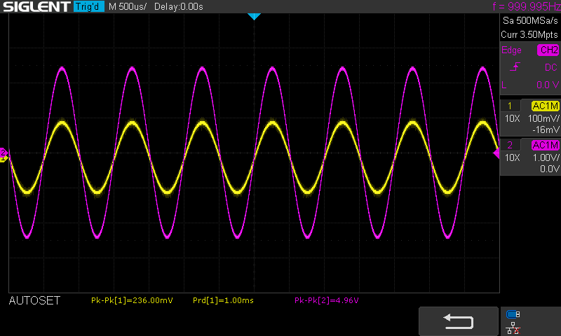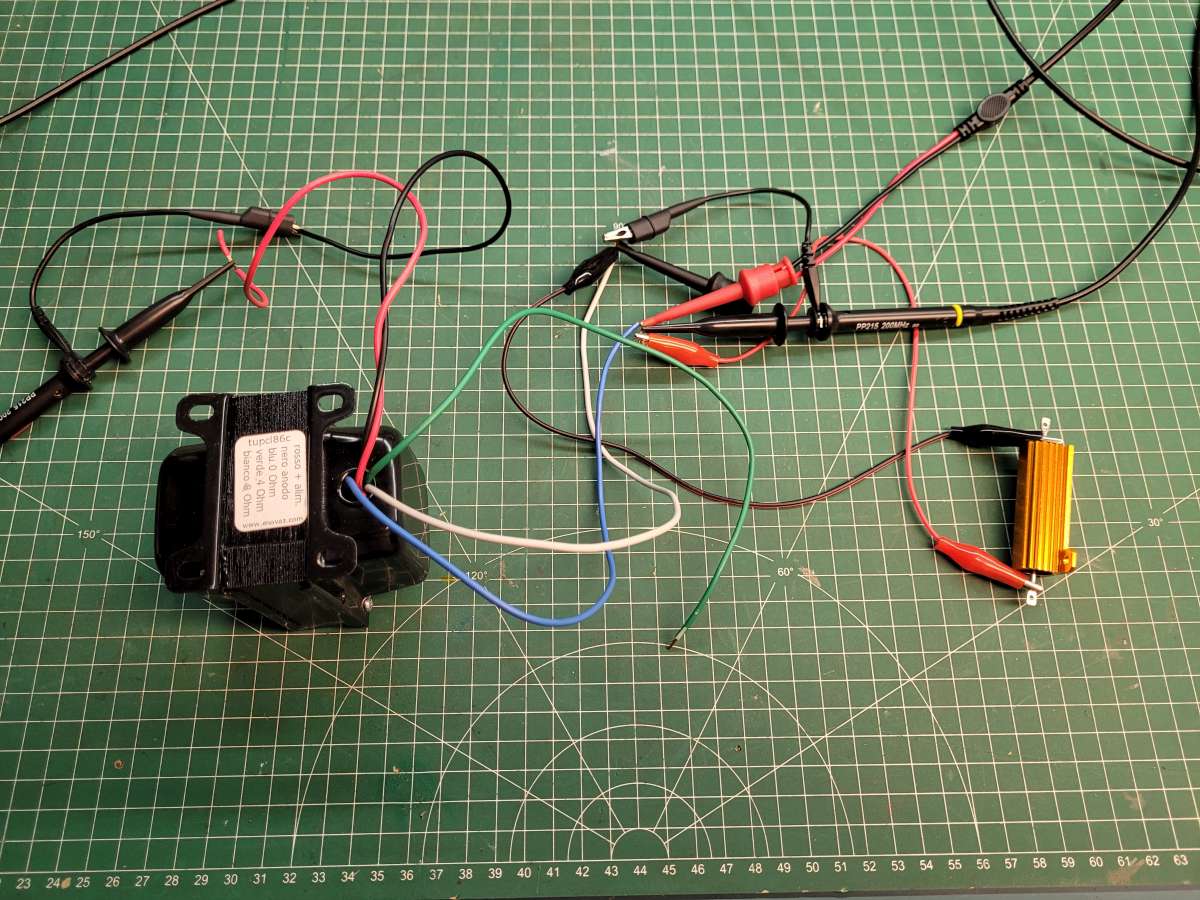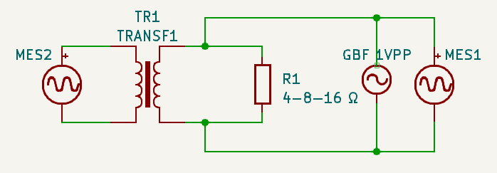 Le principe de la mesure est très simple, il se passe en deux temps :Pour mesurer le rapport de transformation d'un transformateur de sortie audio, il est nécessaire de se mettre dans les mêmes conditions que dans son usage. Et donc, on place une résistance au secondaire de la valeur du haut-parleur de 4-8 ou 16 ohms. Ensuite, on applique une tension au secondaire avec un générateur base fréquence (GBF). Par exemple, un signal de 1V crête à crête (peak-to-peak) à 1Khz.