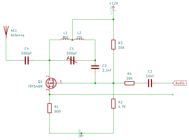 Dans son principe, il s'agit d'un oscillateur dit de Hartley (Q1-L1-L2-C1-C2) qui est couplé avec un mélangeur. En effet, le signal audio traverse un filtre passe bas formé par C3-R2-R4, puis alimente la grille du transistor Mosfet IRF540N. La tension de grille module l'amplitude de l'oscillation au grés du signal audio. Le transistor Q1 combine ainsi trois fonctions amplificateur-oscillateur-mélangeur/modulateur.
