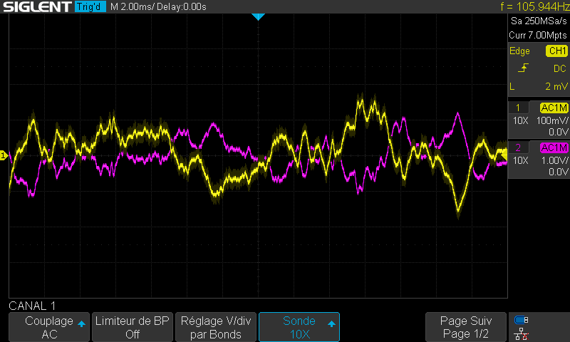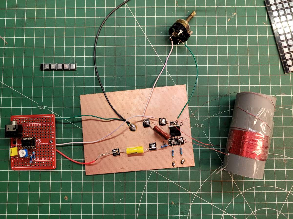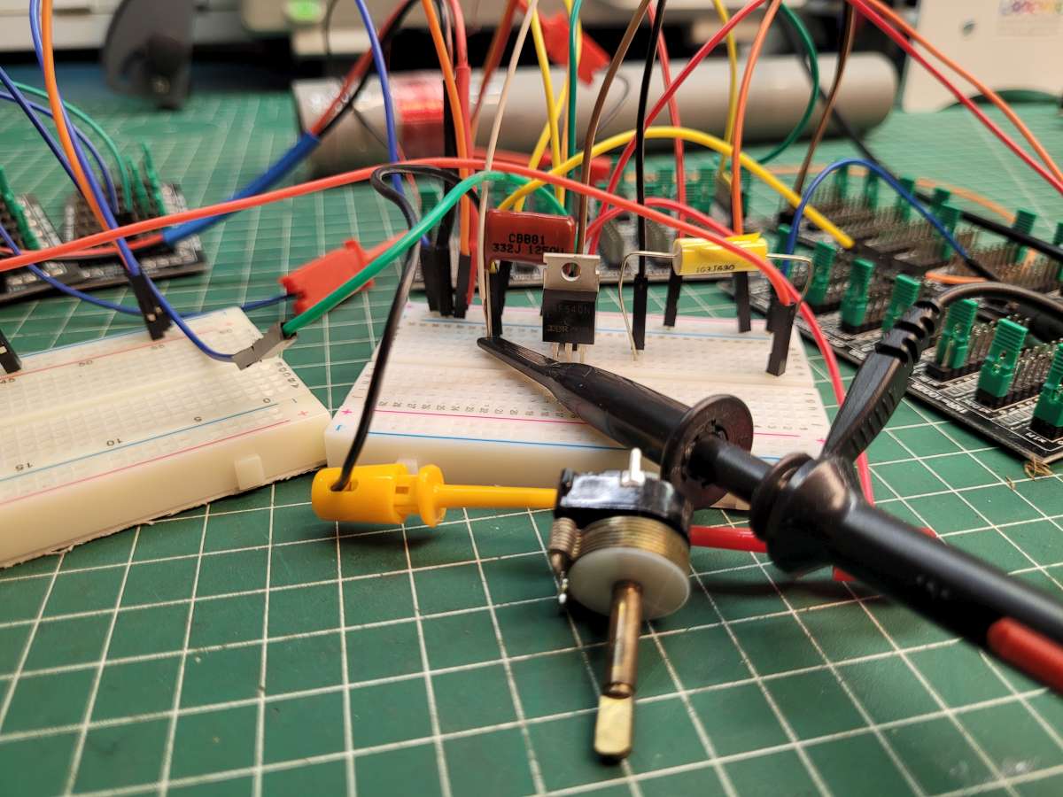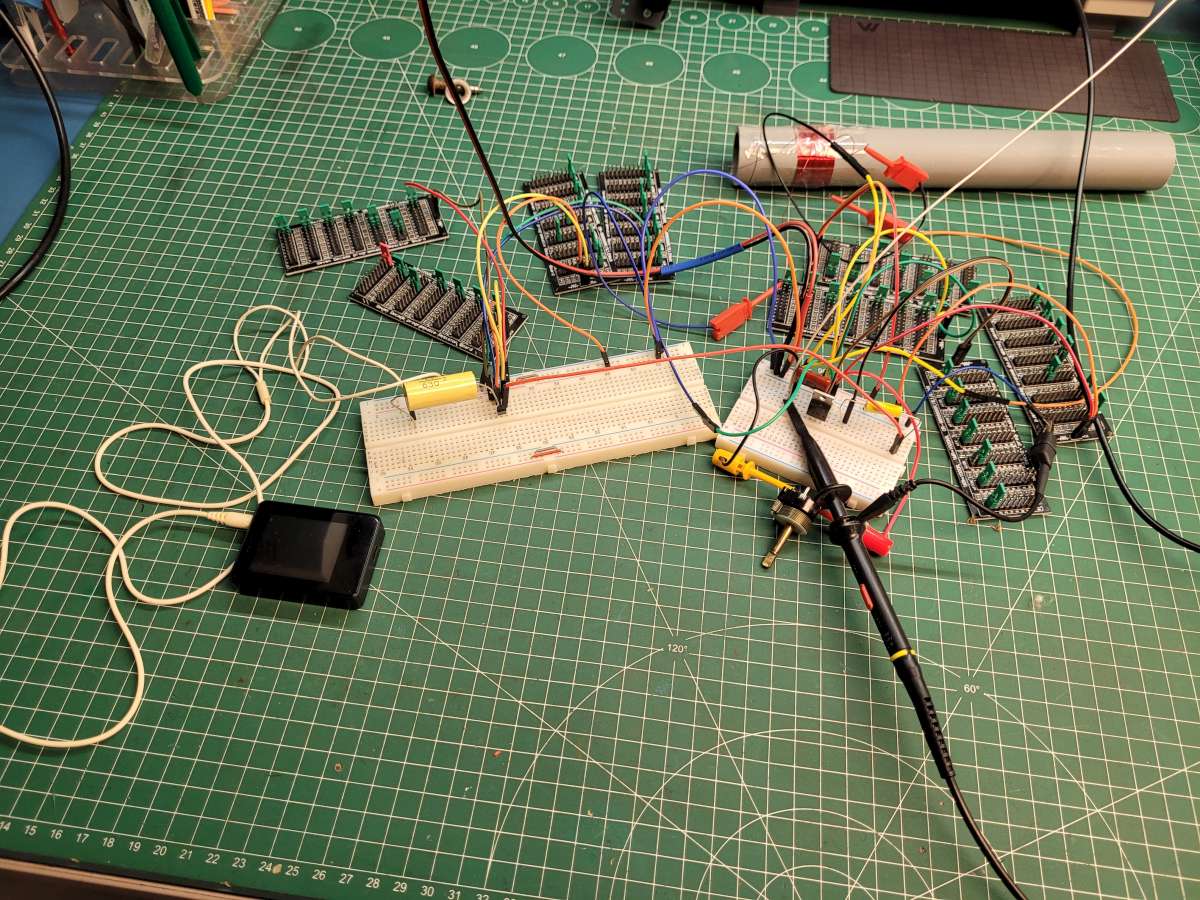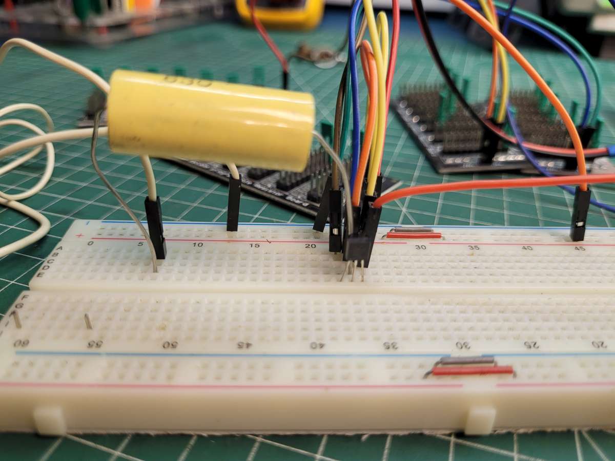 J'ai réalisé ce schéma sur breadboard sans trop prendre de soin. Le circuit fonctionne mais reste très sensible aux perturbations électromagnétiques (bruit) extérieurs notamment provoquées par l'alimentation à découpage de mon bandeau leds.