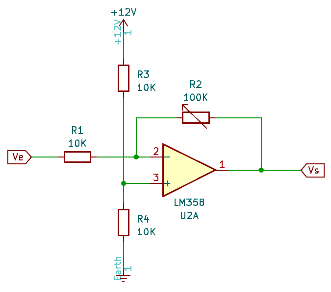 On a Vs=-(R2/R1)Ve avec R2 est un potentiomètre de 100K, R1 est une résistance de 10K qui permet un gain variable de 0 à 10 pour ce circuit.