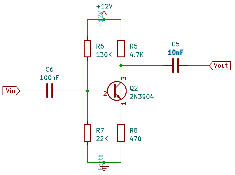 Le circuit fonctionne mais la puissance reste très relative, le poste radio ne reçoit plus rien à deux mètres. (Peut-être par la piètre mon antenne qui est un bête cable de 4m...) D'où l'idée de réaliser une petite pré amplification en amont de l'émetteur. J'ai réalisé le schéma ci-dessous pour cet étage de pré-amplification.