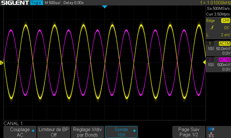 Soit un gain G?-Rc/Re dans notre cas G=4700/470=10 A l'oscilloscope on observe bien le gain attendu.