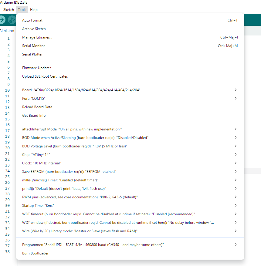 3) Dans Tools --> Board --> megaTinyCore --> sélectionner l'option qui correspond à l'ATtiny414