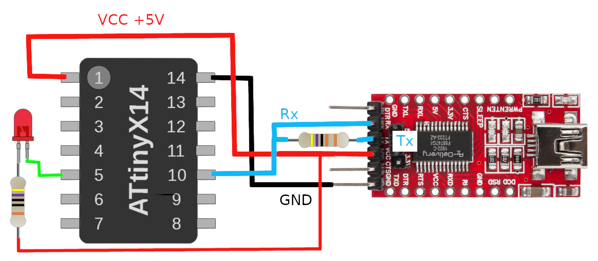 Les pin Rx et Tx de l'adapteur USB-TTL sont raccordées à la pin 10 de l'UPDI de l'ATtiny414. Une résistance de 4.7K ohms protège le Tx. Il est possible de mettre une diode dans le sens passant de transmission de Tx. Perso, je ne l'ai pas fait et cela marche très bien sans.