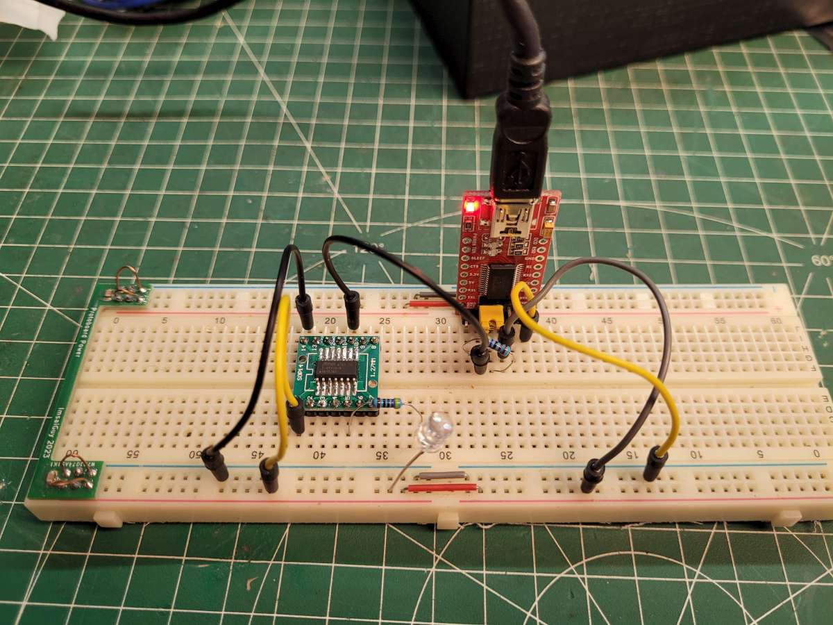 Sur une breadboard, il suffit de mettre en oeuvre notre petit schéma par l'intermédaire d'une plaquette d'adatation SOP14.