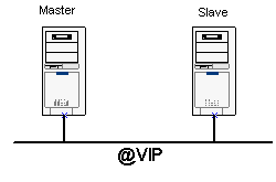 Prenons l'exemple ci dessous, on veut mettre en cluster 2 serveurs avec une reprise du serveur esclave. Le principe consiste à se partager une adresse IP virtuelle, "mountée" par le serveur maître en fonctionement normal ou par le serveur esclave si le maître est indisponible. Les clients pointants vers l'adresse virtuelle, ainsi toujours joignable.