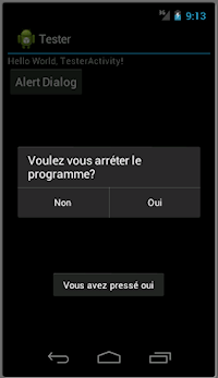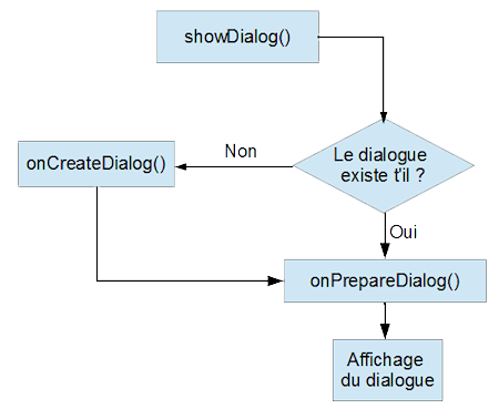 Les dialogues sont des messages qui s'affichent sur la vue en cours.Le framework Android définit une classe Dialog qui a plusieurs sous-classes tels que AlertDialog (boite de dialogue), ProgressDialog (Progressbar avec bouton), TimePickerDalog (sélecteur d'horaire), DatePickerDialog (sélecteur de date),....