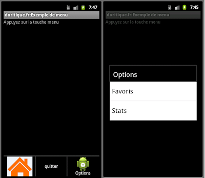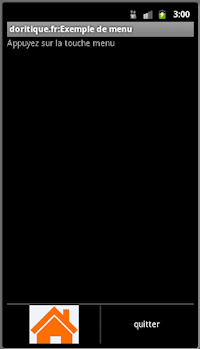 Les menus sont accessibles par le bouton du mobile Android. Très utiles pour réaliser un menu contextuelle, l'accès a un formulaire, ...Bien évidemment, le framework Android encadre la gestion des menus.