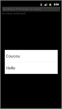 Android propose la fonctionnalité de menu contextuel. Elle est peu utilisée, mais en gros c'est un menu qui apparaît lors d'un clic long sur un objet.La méthodologie est quasi identique à ce que nous avons vu, sauf que le menu contextuel doit être déclaré par la méthode registerForContextMenu() pour les vues qui disposent d'un menu contextuel. Ensuite, on surcharge la méthode onCreateContextMenu().