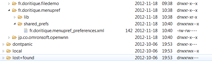 Ce qui est intéressant à noter, c'est la simplicité de mise en oeuvre, mais aussi le mode de stockage. Comme nous le disions initialement, les valeurs sont stockées sous forme de PreferenceShared, donc sous forme d'un fichier xml (dans notre exemple sous /data/app/data/fr.doritique/fr.doritique.menupref_preference.xml).