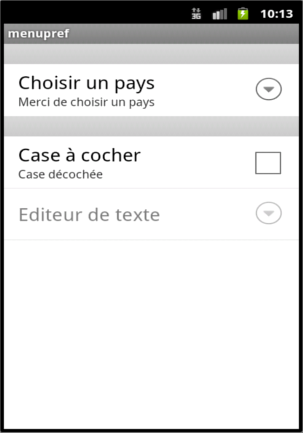 Il est possible de hiérarchiser également les écrans en imbriquant les PreferenceScreen les uns dans les autres. Si on clique sur la zone, une activité est lancée est une vue associée apparaît.Par exemple: