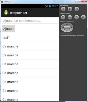Le mieux comme toujours, c'est de proposer un exemple de code. Pour cela nous allons reprendre, l'application que nous avions réalisée avec SQLite dans laquel nous allons insérer notre provider que nous nommerons "monfournisseur".Pour la View, nous afficherons la liste des données de la base de données sans modifier le code, et nous nous contenterons simplement de faire une insertion par l’intermédiaire de notre fournisseur de contenu. A noter que nous avons choisis un exemple minimaliste car la mise en oeuvre devient très rapidement complexe et assez peu lisible.