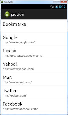 Nous allons voir un exemple d'usage de query en utilisant le fournisseur de contenu standard Brownser. L'objectif de notre exemple est de lister les favoris du Browser, appelé BookMark.