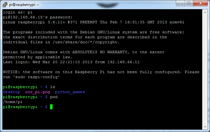 Comme je vous le disais juste avant, j'ai opté sur la facilité en choisissant une configuration plug & play. Donc, juste le temps de trouver un câble réseau pour le brancher sur ma box, de mettre la carte SD dans le slot du raspberry pi (attention de bien enfoncer la carte!) et de l'alimenter par le port microusb directement relié à mon ordinateur.Ensuite, par habitude je recherche l'adresse IP du raspberry dans ma plage d'adresses IP DHCP configuré dans ma box. Il suffit pour cela de faire quelques ping pour l'identifier. Ensuite, je tente une connexion grâce à l'utilitaire Putty en SSH. Et çà marche! j'ai l'invite de commande. Pour se connecter la première fois, le compte est pi et le mot de passe est raspberry. Pour initialiser le raspberry, il faut taper la commande sudo raspi-config. Ensuite, il ne faut pas oublier d'initialiser le mot de passe root du sudo par sudo passwd.
