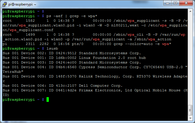 Une fois la clé connectée, vous pouvez vérifier avec la commande lsusb et si elle a été détectée par l'OS. Pour moi, la clé est reconnue par Bus 001 Device 005: ID 148f:5370 Ralink Technology, Corp. RT5370 Wireless Adapter. Ensuite, il faut implémenter le driver que vous trouverez sur site du constructeur. Me concernant, le driver est déjà implémenté sur la Raspian. Cool!