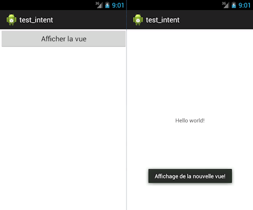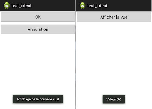 L'intention est la meilleure méthode pour ouvrir une vue et donc une activité. Pour cela, on instancie un objet Intent en précisant la classe de l'activité à ouvrir. Attention à ne pas oublier de préciser dans l'application définie dans le fichier manifest la nouvelle activité. Voici un exemple de code pour lancer une activité dans l'application courante.Il faut créer la nouvelle activité à ouvrir: