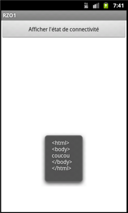 La première chose à faire lorsque l'on veut réaliser une application réseau est de tester si le réseau est bien présent! Android propose la classe ConnectivityManager. Voici un exemple simple qui affiche la connectivité du réseau. Le layout:Pour le programme principale: