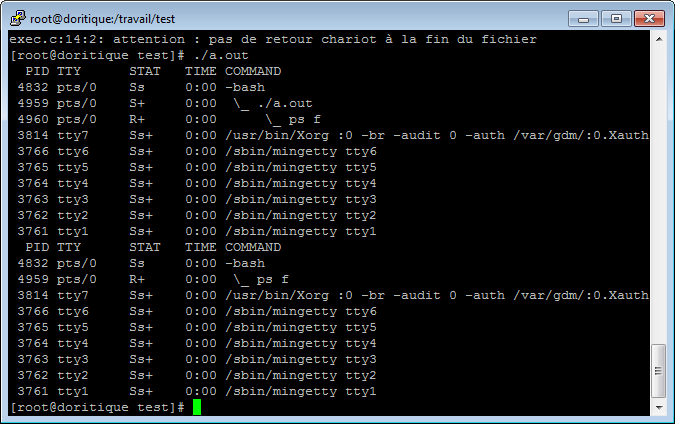 Cette fonction remplace le processus courant par un autre en chargeant le programme passé en paramètre. Il y a écrasement en mémoire du code et des données, mais le processus conserve son numéro de PID.Il y a une famille de fonction exec*, voyons avec l'exemple ci-dessous.