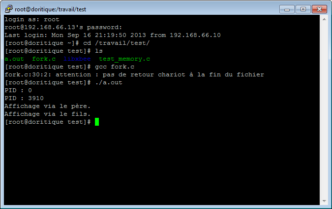 Donc: Juste après le fork(), les processus sont exactement les même, ils exécutent le même code avec les même données. Comment les différencier? Et bien, en testant le retour du fork(), si le processus reçoit 0, il s'agira du fils, et s'il reçoit le PID du fils, c'est que c'est le père.