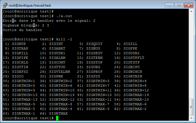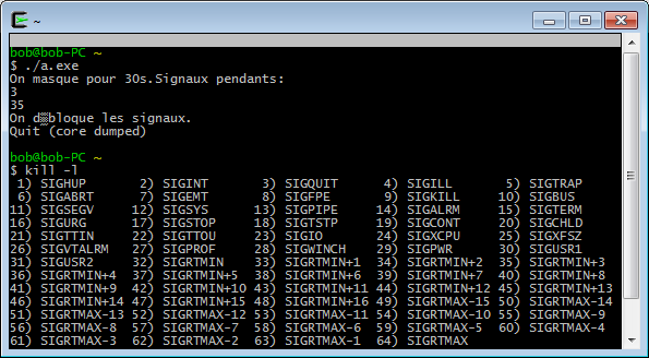 Il est à noter que la commande kill -l liste les différents signaux du système, ils peuvent différer d'une distribution à une autre c'est pourquoi il est vivement conseillé de coder avec nom des signaux pour avoir un code portable. La commande kill du bash est kill -code num_process.