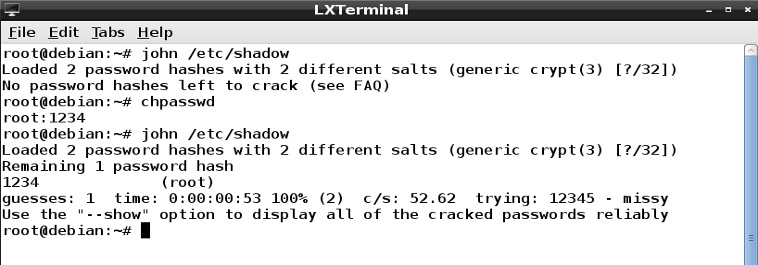 Pour cela, il faut installer l'application John the ripper, sous debian : apt-get install johnJ'ai positionné un mot de passe facile (1234) simple afin que la recherche ne prenne pas trop de temps. Ensuite, il suffit de lancer la commande : john /etc/shadow