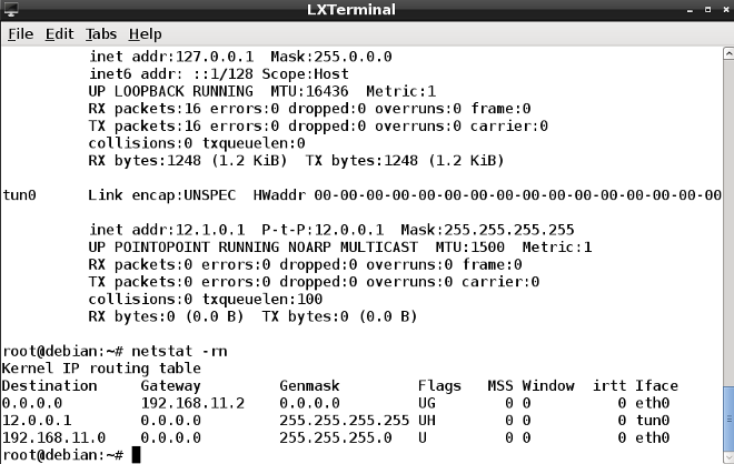 Pour tester le canal, il suffit alors de pinguer les interfaces virtuelles tun0 par ping 12.0.0.1 et ping 12.1.0.1 selon si vous ĂŞtes sur le serveur ou sur le client.