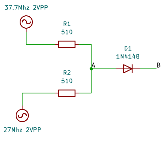 Une diode utilisée dans un mélangeur RF sert à réaliser une opération de multiplication de signaux (RF × OL = fréquences somme et différence). Le choix de la diode est crucial pour les performances (bruit, linéarité, fréquence max, pertes). Une diode Schottky est le plus couramment utilisée car elle est très rapide et présente un seuil assez faible de l'ordre de 0.2-0.3V. Pour tester, j'ai pris une 1N4148 que j'avais sous la main et qui fait très bien le job.