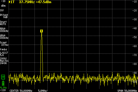 Autre exemple, le fameux ADE-1 en composant de surface. Sans la fréquence locale, puis avec, on observe bien un le signal transporté à 57.7Mhz (soit 37.7+20).