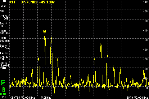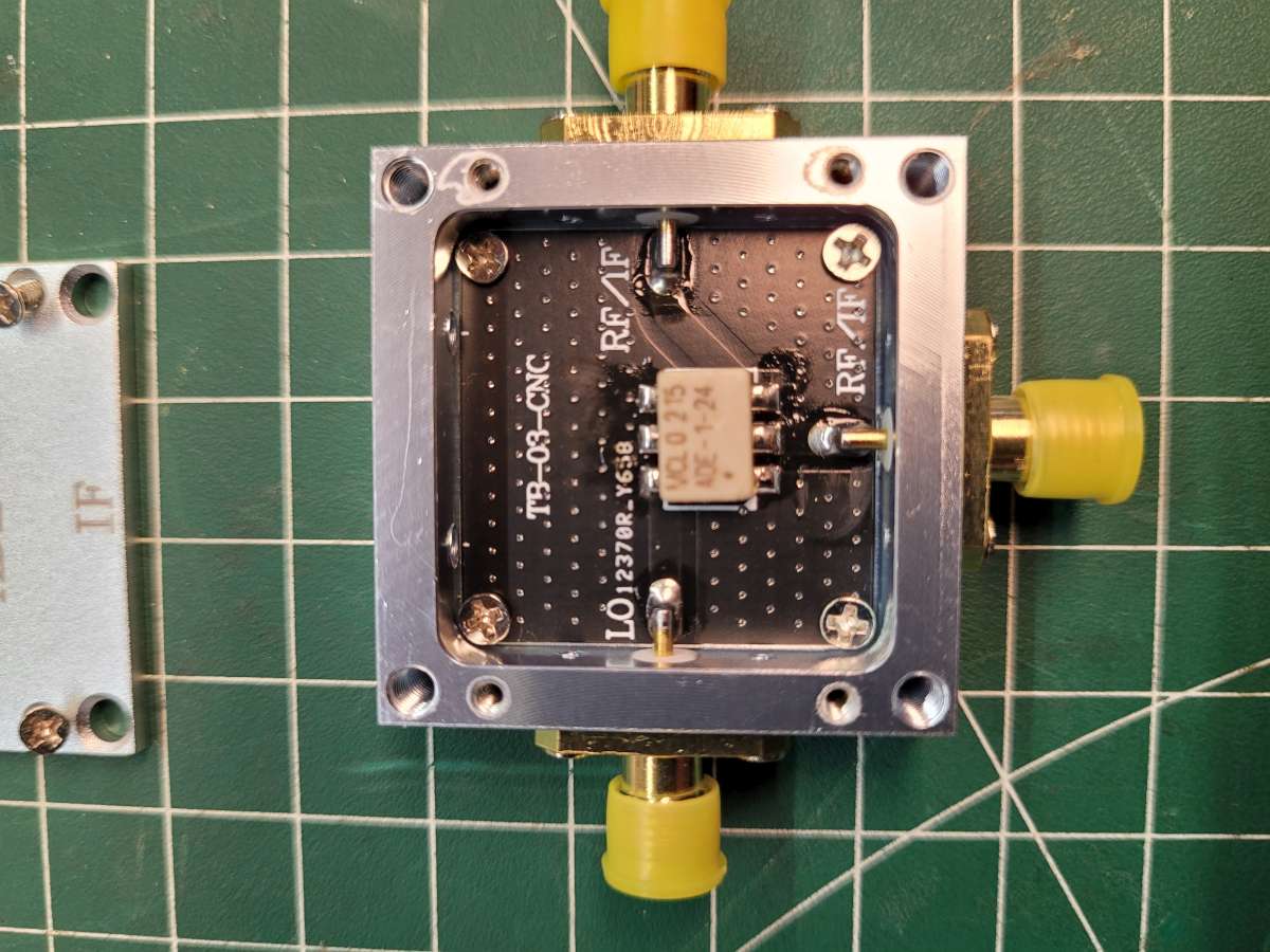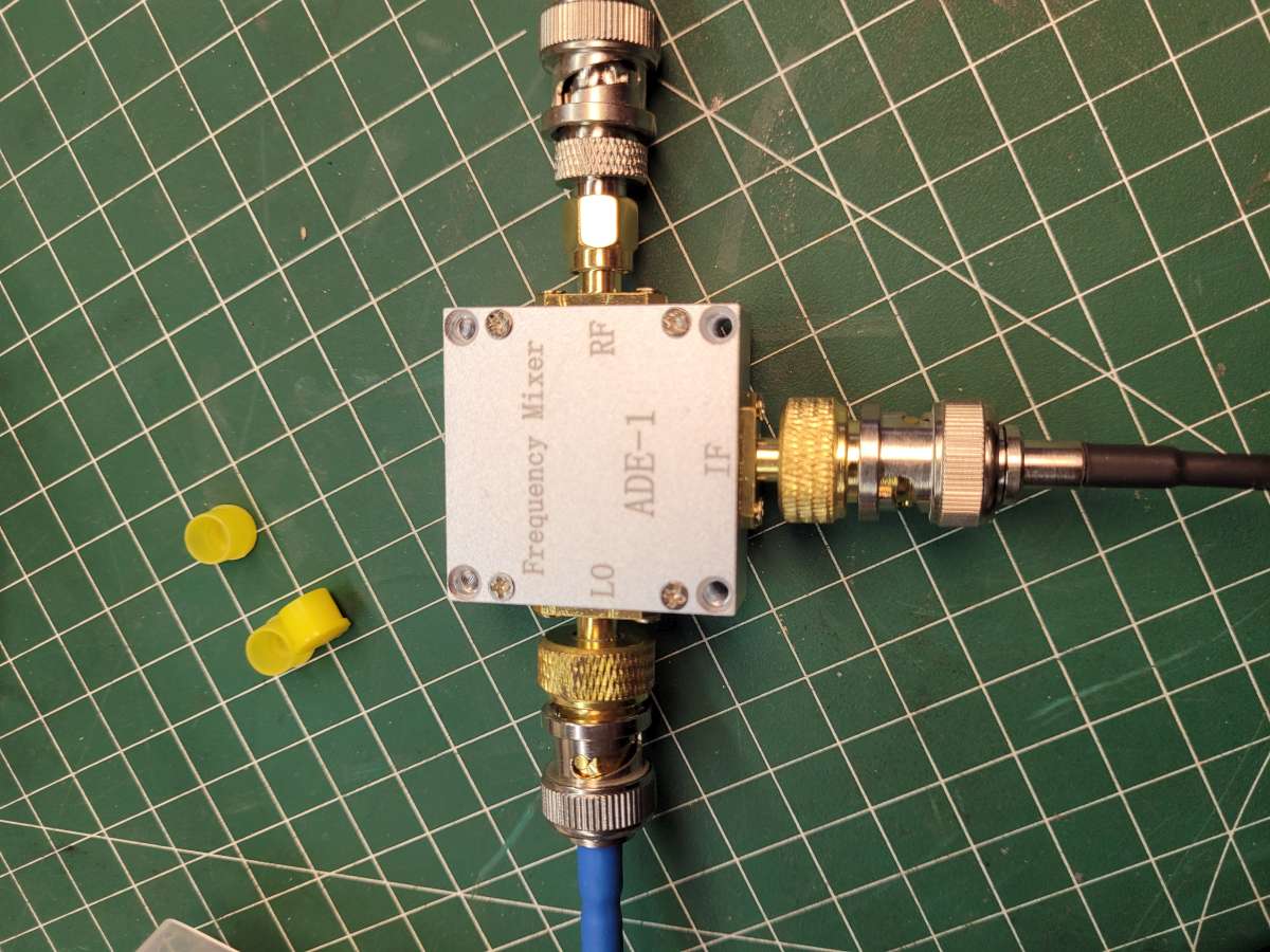 La société mini-circuits propose ce type de mélangeurs sous forme de petits boitiers électronique traversant. Essai avec les mêmes fréquences 37.7Mhz en RF et 20Mhz en oscillateur local.