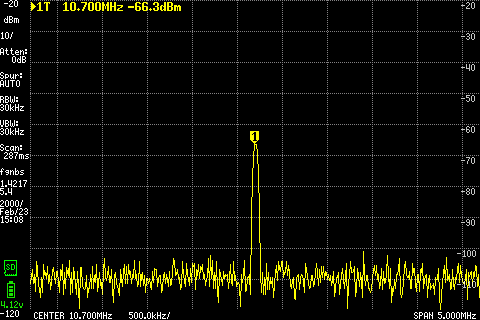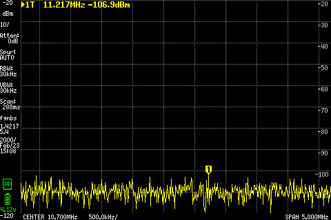 Si on recentre sur 10.7Mhz (avec un span limité à 50khz) qui est la fréquence de différence des deux signaux. En A, il n'y a rien. Et en B, on observe bien le signal mixé par la diode avec une translation du signal à 10.7Mhz.