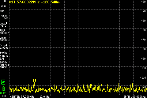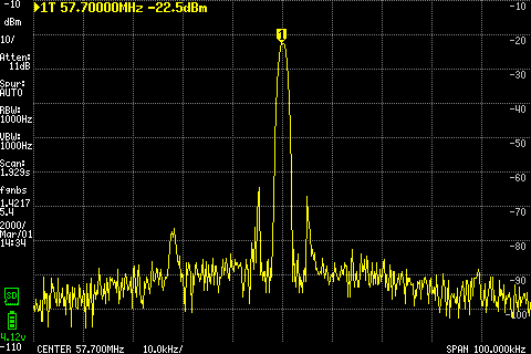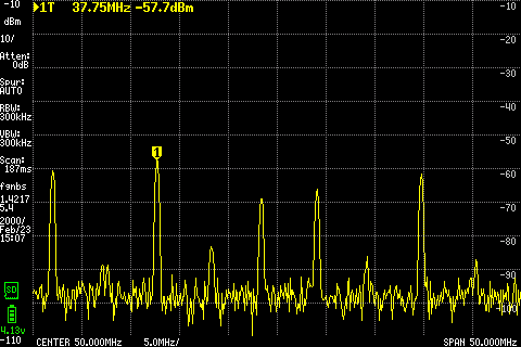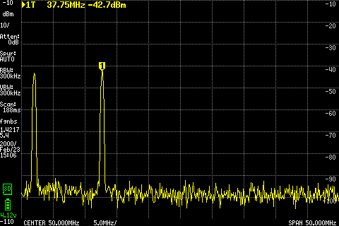 Autre exemple, le fameux ADE-1 en composant de surface. Sans la fréquence locale, puis avec, on observe bien un le signal transporté à 57.7Mhz (soit 37.7+20).